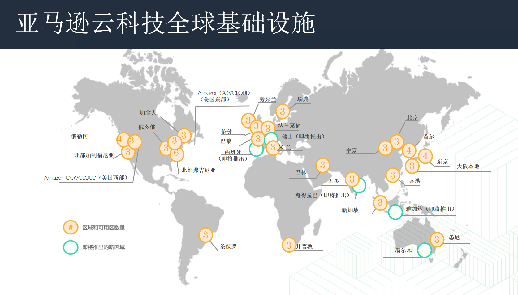 亚马逊云计算,其核心竞争力在于提供全面、分层且可扩展的云服务体系。上图可见亚马逊云科技在全球配置的基础设施,节点非常多,可以满足大部分客户的节点需求。